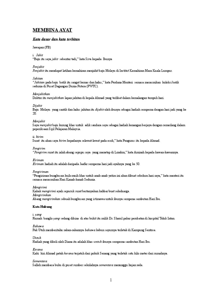 Contoh Bina Ayat Perdana. FIFA juga mengumumkan Brazil akan berada di Kumpulan F. Saya terlihat adik terduduk diam di sebelah ayah kerana dia sakit.